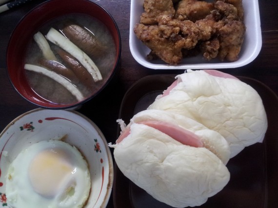 パンとみそ汁と目玉焼きと唐揚げ。
