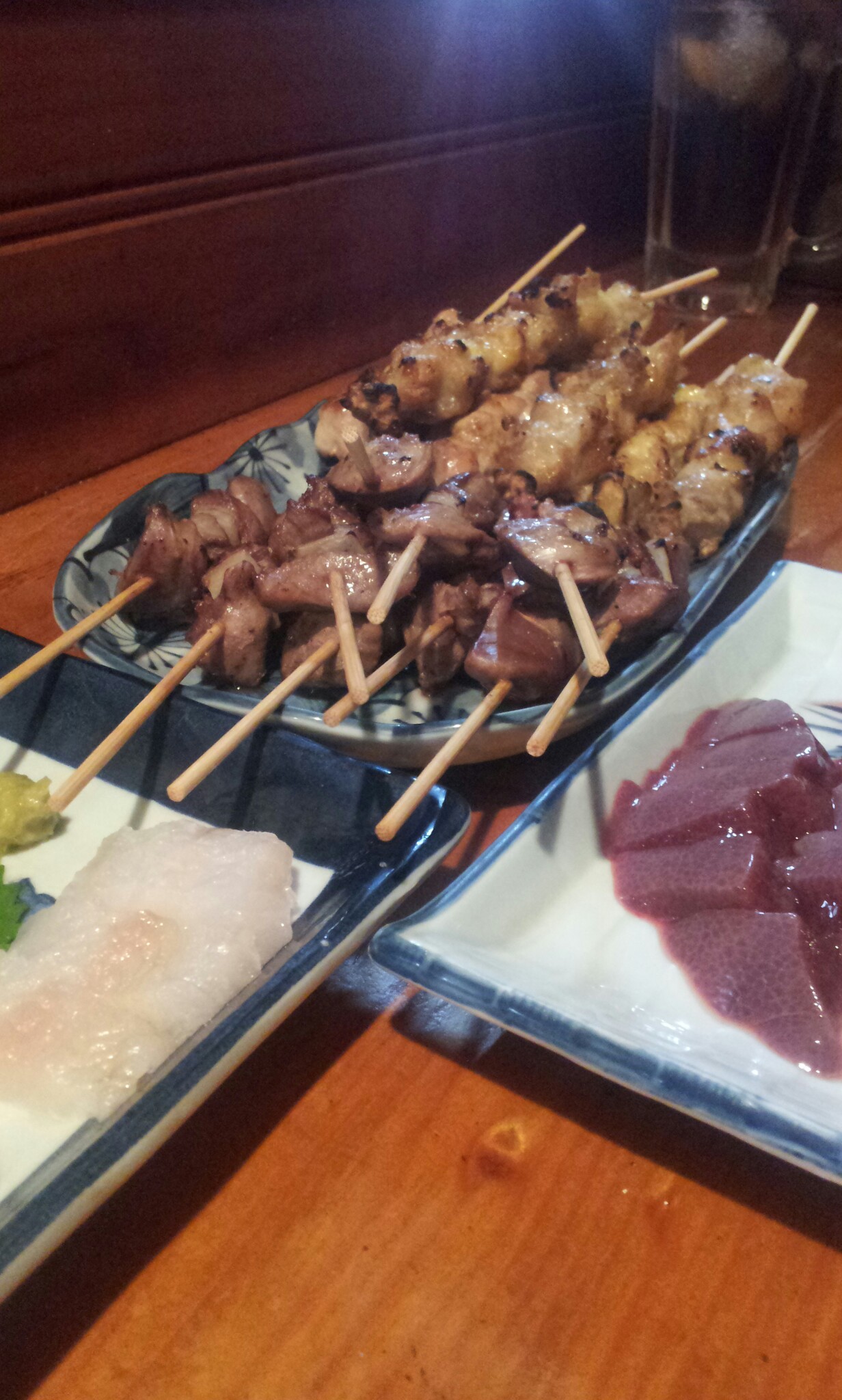 ↓↓↓ おっと。焼き鳥20本1200円&アイナメとソイのお刺身300円もきた。030きゃー 氷1:ウーロン茶2:焼酎7 で作られる「ウーロン割」 033このあたりからチャンイケ先生も合流して大盛り上がり。