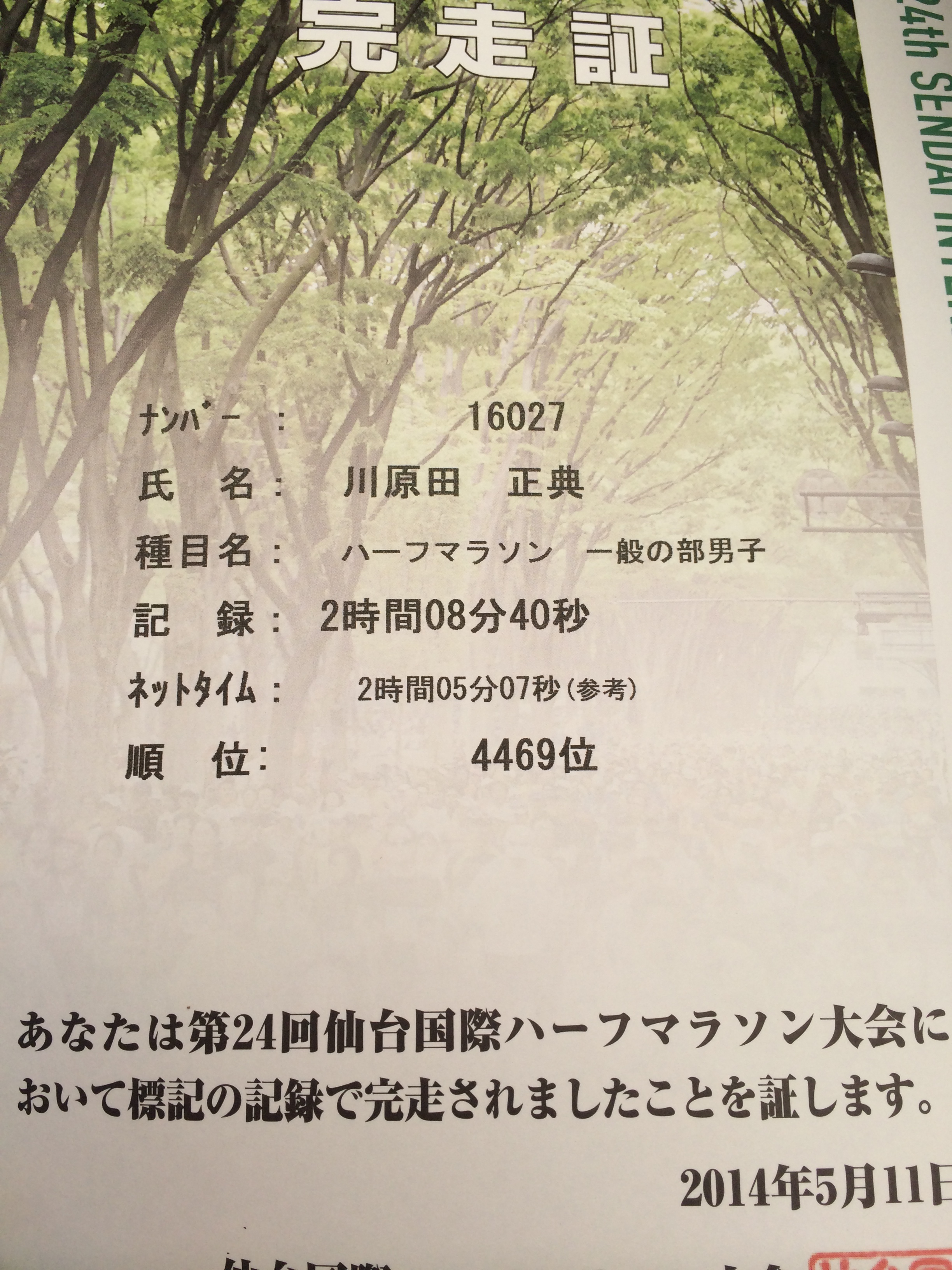 仙台ハーフの結果。フフフ。